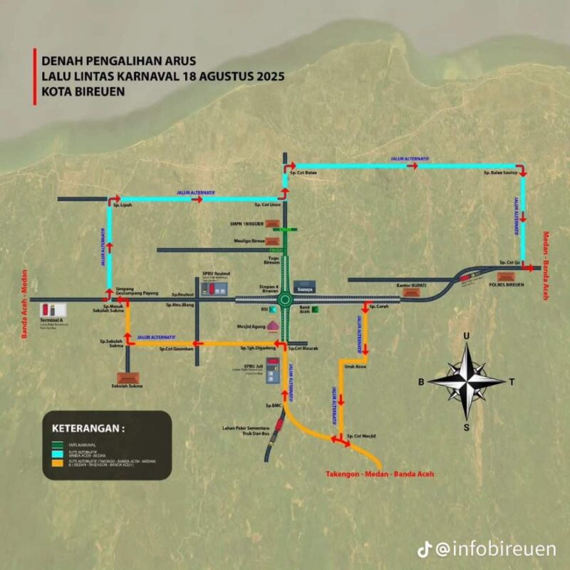 Pawai dan karnaval HUT RI dilaksanakan Senin siang, 18Agustus 2025 pukul 14.00 WIB. Pergerakannya dimulai dari Start : Depan SMPN 1 – Depan Polsek Kota Juang – Tugu Kota Juang – SP.4 – Depan Rumah Sakit BMC – Depan Mesjid Agung – Finish Pendopo Bupati ), Kabupaten Bireuen.