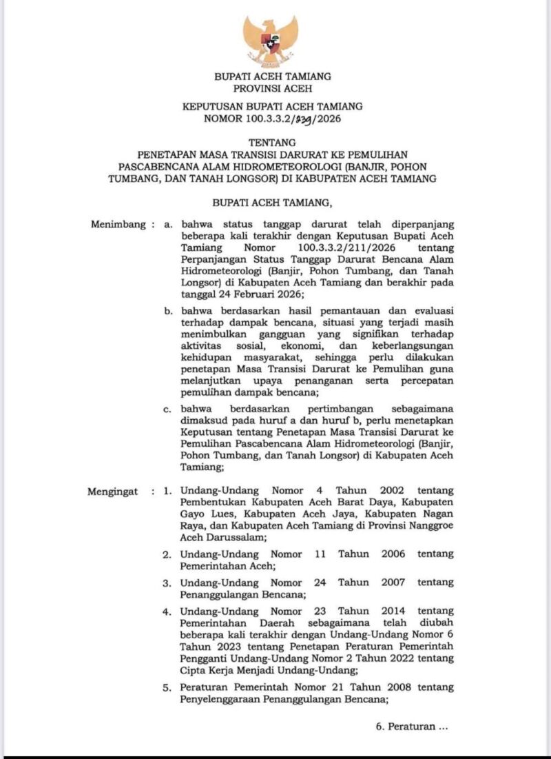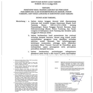 Kamis, (26/2/26) Pemerintah Kabupaten Aceh Tamiang secara resmi mengakhiri masa tanggap darurat dan menetapkan masa transisi pemulihan pascabencana selama 90 hari ke depan.
