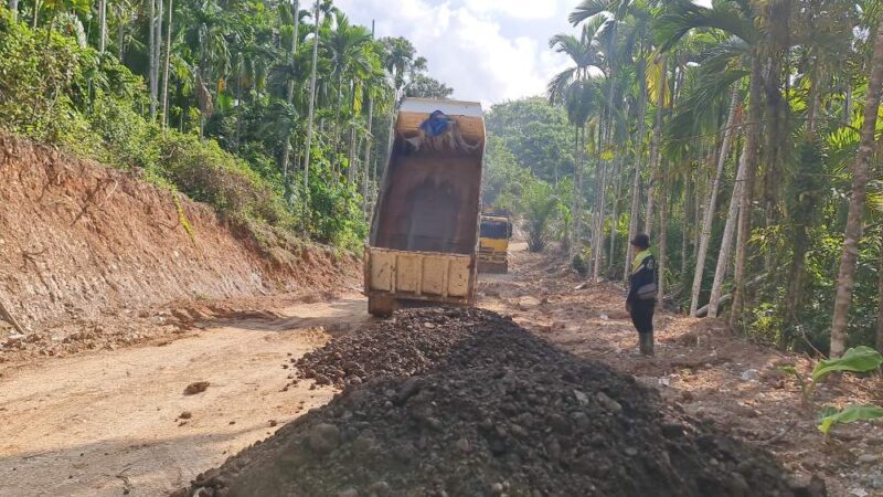 Material yang diangkut menggunakan dump truck tersebut diturunkan langsung di lokasi sasaran fisik TMMD. Anggota Satgas TMMD tampak sigap mengatur proses penurunan material agar dapat segera diratakan dan dimanfaatkan untuk pengerasan badan jalan.