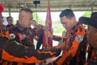 Foto :SERAHKAN: Ketua MPC PP Deli Serdang, Junaidi saat menyerahkan pataka kepada Bondan. Junaidi foto bersama dengan pengurus MPW, MPC dan PAC serta Bondan….
