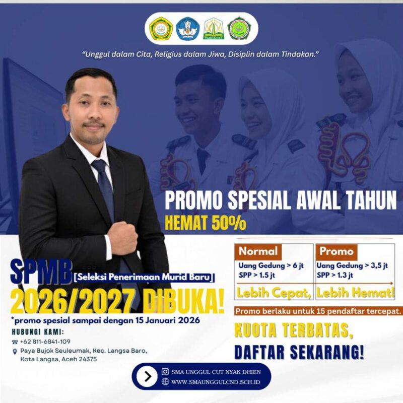 Dengan kebijakan Manajemen Pimpinan SMA Unggul CND Langsa yang bertujuan untuk menumbuhkan semangat minat belajar bagi para calon Siswa Siswi Baru Tahun ajaran 2026-2027 maka bagi Pendaftar Seleksi Penerimaan Murid Baru (SPMB) di awal Tahun 2026 ini memberikan Promotion (Potongan harga) sebesar 50%. dengan rincian