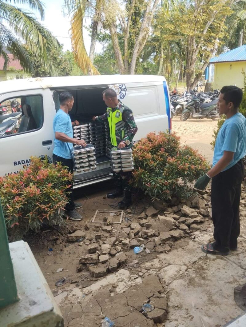 Babinsa Koramil 09/Banda Mulia Serka Erwan mendampingi pelaksanaan Program Makan Bergizi Gratis (MBG) SPPG Desa Paya Rahat ke SMP Negeri 4 Bendahara Di Desa Telaga Meuku Sa, Kecamatan Banda Mulia, Kabupaten Aceh Tamiang. Jumat (24/04/2026)
