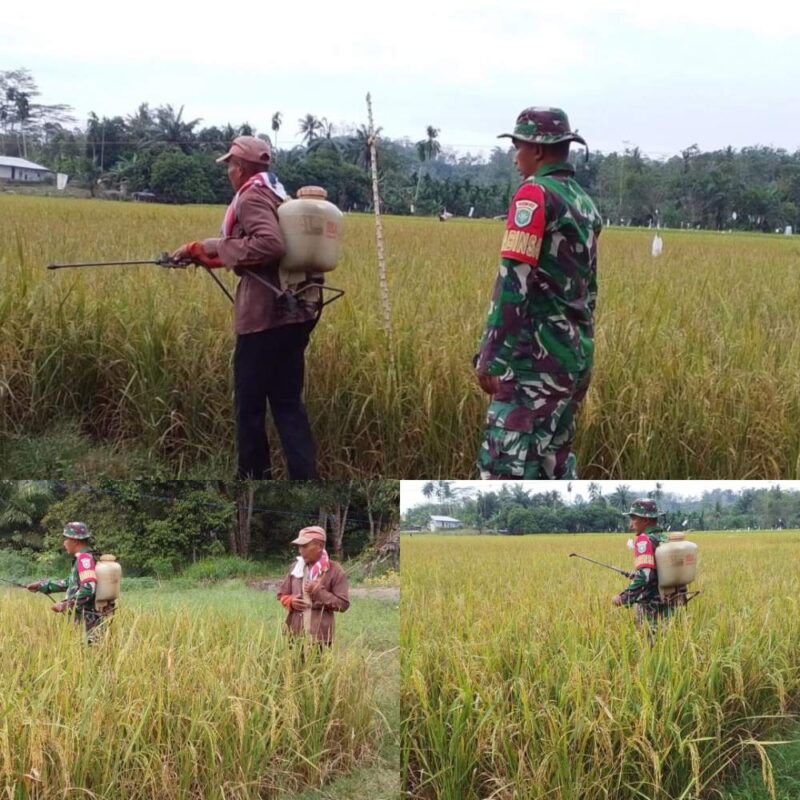 Babinsa Koramil 06/Manyak Payed Serda Irwansyah bersama petani melaksanakan kegiatan perawatan tanaman padi berupa penyemprotan tanaman, bertempat di lahan milik Bapak Sukardi Desa Seunebok Punti, Kecamatan Manyak Payed, Kabupaten Aceh Tamiang. Rabu (25/03/2026)