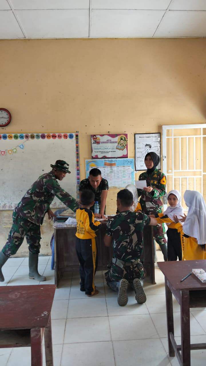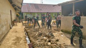 Anggota Koramil 06/Manyak Payed bersama Taruna Taruni Akmil bahu-membahu membersihkan sisa lumpur di parit sekola, sampah, dan pengecatan sehingga para siswa nyaman dalam belajar pasca bencana.