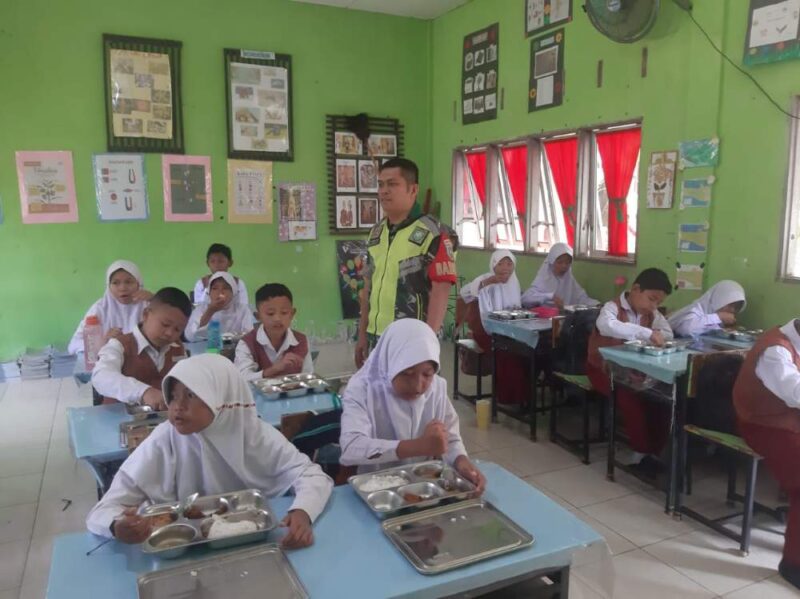 Babinsa Koramil 08/Rantau Serka P Ginting melaksanakan pendampingan dalam pembagian makanan bergizi gratis di SDN 1 Paya Bedi di Desa Paya Bedi, Kecamatan Rantau, Kabupaten Aceh Tamiang. Rabu (20/08/2025)
