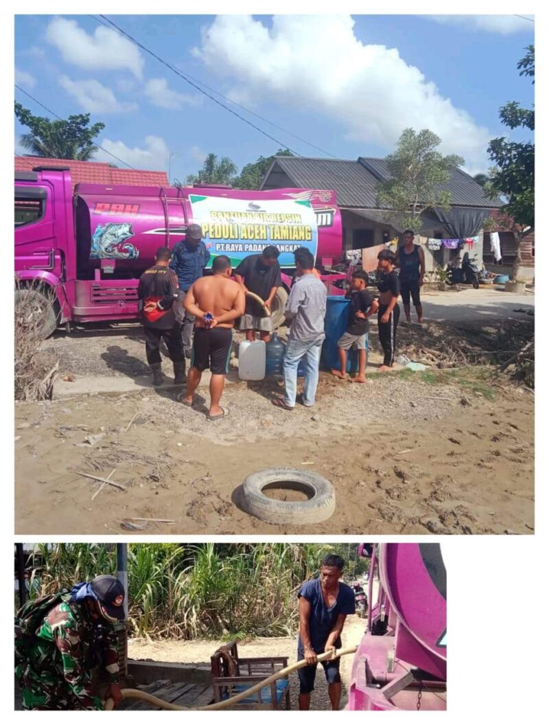 Dalam operasi bantuan kemanusiaan ini, Babinsa Koramil 09/Banda Mulia Sema Darmi bekerja sama dengan petugas PT Rapala memastikan distribusi air bersih berjalan optimal.