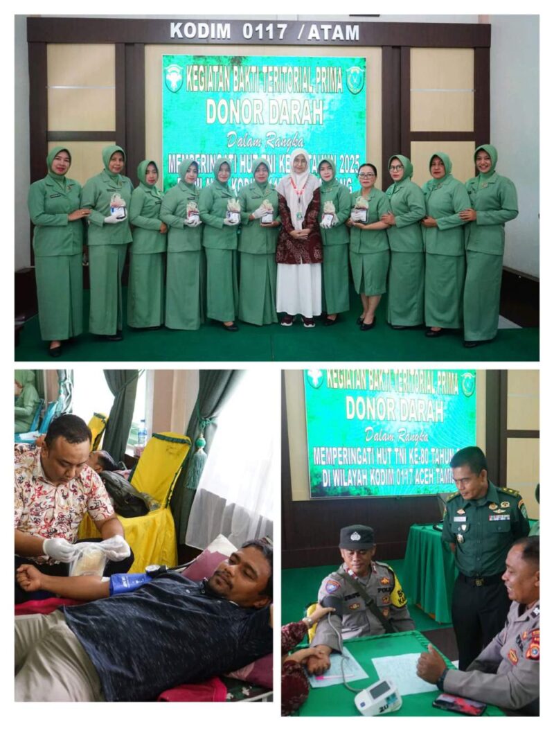 Kasdim 0117/Aceh Tamiang Mayor Cpm Lili Fitriadi saat di konfirmasi oleh penerangan kodim seusia melaksanakan Donor Darah mengatakan “kegiatan Bakti Teritorial Prima Donor Darah dan Pengobatan Gratis ini bekerjasama dengan RSUD Muda Sedia Kabupaten Aceh Tamiang dalam rangka menyambut HUT TNI ke 80.