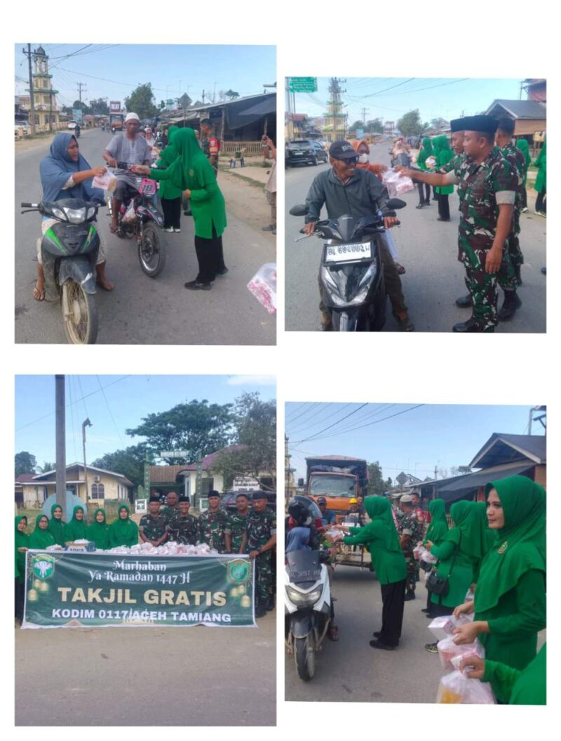 Dalam rangka meraih keberkahan di bulan suci Ramadhan 1447 H Berbagi kebahagiaan di bulan suci Ramadan, Koramil Jajaran Kodim 0117/Aceh Tamiang di antaranya Koramil 07/Kejuruan Muda, Koramil 06/Manyak Payed, Koramil 05/Tamiang Hulu melaksanakan kegiatan pembagian takjil kepada pengguna jalan dan masyarakat yang melintas di depan Makoramil 07/Kejuruan Muda, Desa Sungai Liput, Kecamatan Kejuruan Muda, Kabupaten Aceh Tamiang. Senin (16/03/2026)