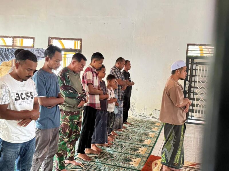 Kegiatan ibadah tersebut dilaksanakan dengan penuh kekhusyukan, menjadi momen jeda dari kerja fisik yang sejak pagi difokuskan pada pembangunan sarana dan prasarana desa. Tanpa sekat antara prajurit dan warga, mereka berdiri dalam satu saf, menyatukan niat, doa, dan harapan demi keberkahan setiap langkah pengabdian.