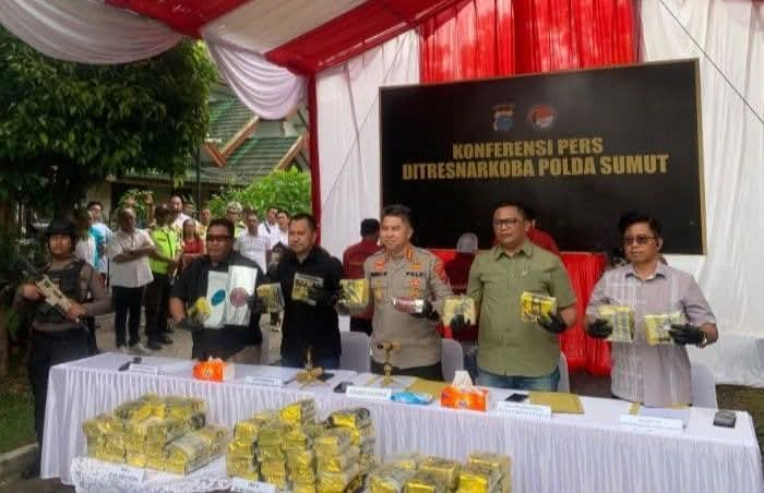 Pengungkapan ini disampaikan dalam konferensi pers di Kompleks Tasbih I Blok SS Nomor : 54, Kota Medan, Sabtu (17/05/2025), dipimpin Direktur Reserse Narkoba Polda Sumut, Kombes Pol. Jean Calvijn Simanjuntak bersama Kabid Humas Polda Sumut, Kombes Pol. Ferry Walintukan dan Wadirresnarkoba.