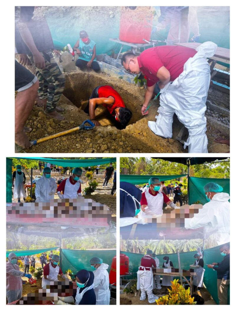 Kegiatan otopsi dimulai pukul 09.50 WIB di Tempat Pemakaman Umum (TPU) Dusun Kamboja, Desa Bukit Rata, Kecamatan Kejuruan Muda, Kabupaten Aceh Tamiang yang dilakukan oleh tim Biddokkes Polda Aceh yang dipimpin Ps. Kaur Doksik Biddokkes Polda Aceh, Iptu drg. Ega Dwi Cahyani, bersama tiga personel Biddokkes Polda Aceh lainnya dengan dukungan dokter dari Pama KSM Forensik Rumah Sakit Bhayangkara TK.I Pusdokkes Polri, Ipda dr. I Made Raditya Mahardika, S.H., M.H., M.A.R.S., Sp.FM. serta didukung penuh oleh Kasi Dokkes Polres Aceh Tamiang Aiptu Faisal Riza Syahputra, AMK.