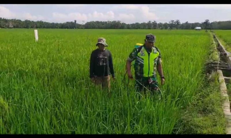 Babinsa Koramil 02/Karang Baru Serka Rusli melaksanakan pendampingan dengan membantu penyemprotan hama padi di sawah milik Bapak Muhammad di Desa Air Tenang, Kecamatan Karang Baru, Kabupaten Aceh Tamiang. Senin (07/07/2025)