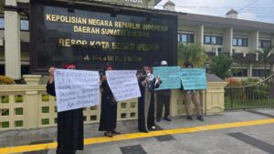 Sembari membawa sejumlah poster yang meminta perhatian Kapolda dan Wakapolrestabes Medan terhadap penyidik Alam Surya Wijaya, yang diduga memiliki “sesuatu” dengan pelapor, Fahril Fauzi Lubis, sehingga terjadi kriminalisasi terhadap terlapor berinisial MDL dan HBL.