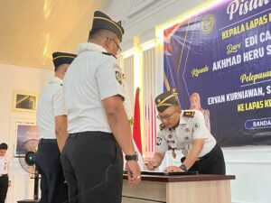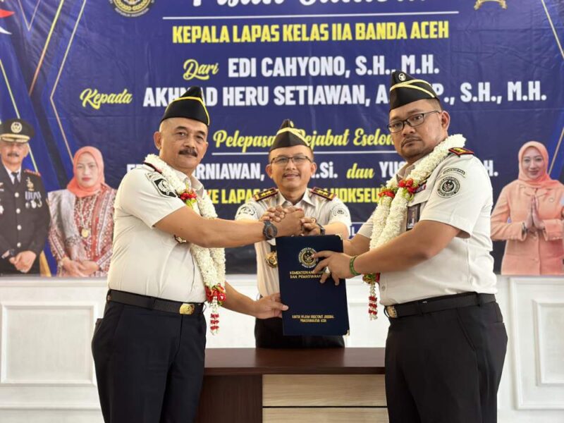Kepala Kantor Wilayah Direktorat Jenderal Pemasyarakatan (Kanwil Ditjenpas) Aceh, Yan Rusmanto hadir langsung memimpin prosesi Serah Terima Jabatan (Sertijab) Kepala Lembaga Pemasyarakatan Kelas IIA Banda Aceh dari Edi Cahyono kepada Akhmad Heru Setiawan, Rabu (29/04/2026).