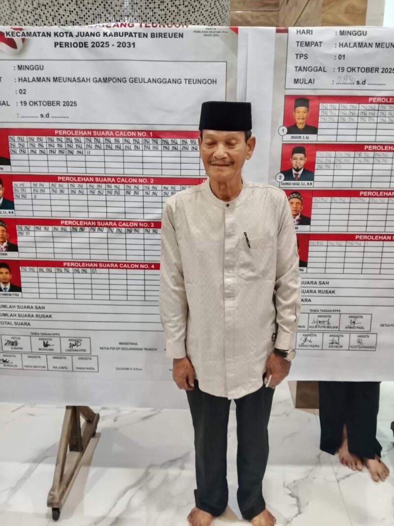Ibrahim, S. Ag berhasil terpilih sebagai Keuchik Geulanggang Teungoh kedua kalinya Masa Bakti 2025 – 2031 setelah berhasil menyisihkan tiga rivalnya Rahmat Hahaz, S.E M. M nomor urut 2, Ridwan nomor urut 3 serta Hendra Ramatan Fitria nomor urut 4.