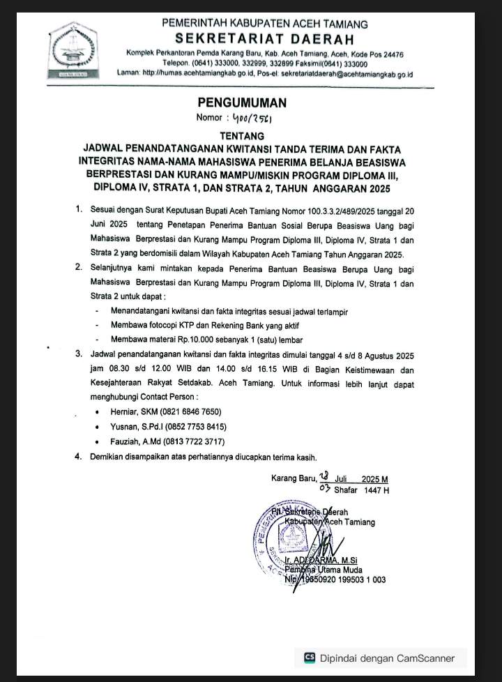 Senin, (28/7/25) Pemerintah Kabupaten Aceh Tamiang melalui Bagian Kesejahteraan Rakyat dan Keistimewaan Aceh Setdakab Aceh Tamiang menginformasikan kepada 542 penerima bantuan beasiswa untuk dapat hadir menandatangani kwitansi dan fakta integritas sesuai jadwal yang terlampir.