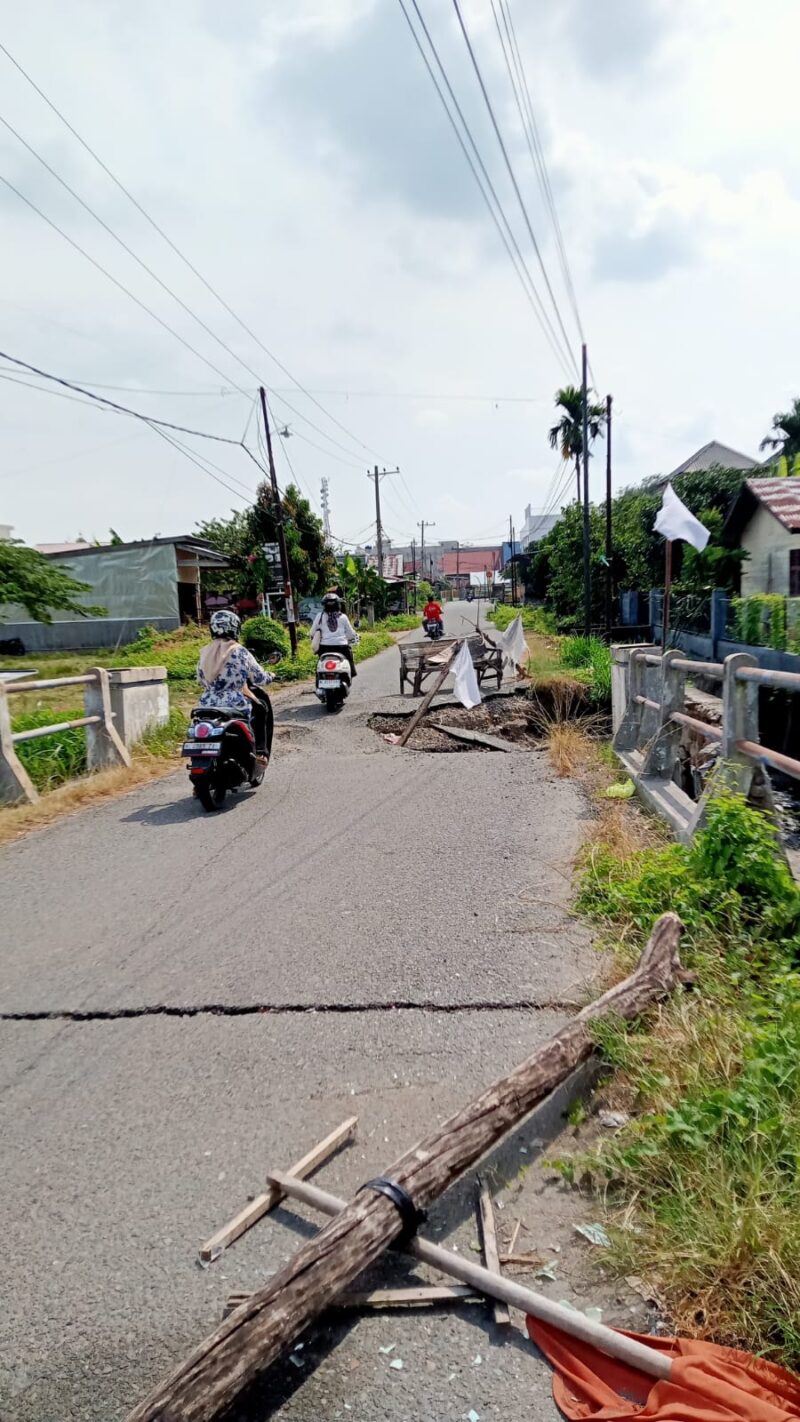 Kondisi ini membuat akses jalanan menjadi tidak nyaman dan berpotensi berbahaya bagi warga yang melintas. Bagian permukaan jalan terdapat retakan jelas, sementara struktur sebagian jembatan tampak rusak dengan material kayu serta barang bekas tergeletak di pinggir jalan dan sebagian menutupi lajur lalu lintas.