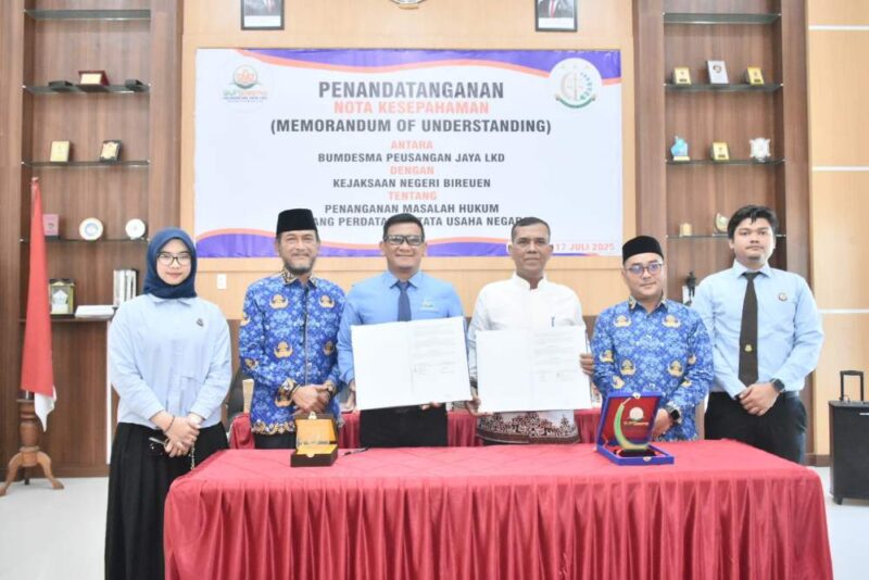 Kepala Kejaksaan Negeri Bireuen Munawal Hadi .S.H.M.H. bersama dengan Direktur Badan Usaha Milik Desa Bersama (BUMDESMA) Peusangan Jaya LKD melakukan Penandatanganan Kesepakatan Bersama (MoU) tentang Penanganan Masalah Hukum Bidang Perdata dan tata Usaha Negara,di Aula Kejaksaan Negeri Bireuen, 17 Juli 2025