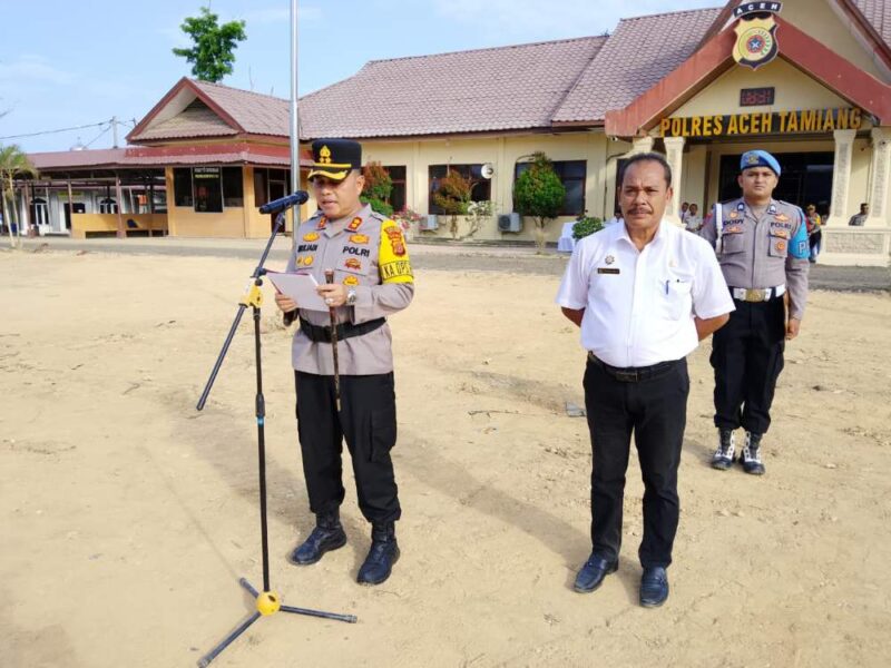 Kapolres Aceh Tamiang AKBP Miliadi, S.H, M.H bersama Bupati Aceh Tamiang diwakili Sekda Aceh Tamiang Drs Syuibun Anwar menjadi inspektur apel dalam apel gelar pasukan ketupat Seulawah 2026.
