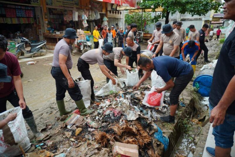 Kegiatan pembersihan tersebut melibatkan personel Polres Lhokseumawe yang dipimpin langsung oleh Kapolres Lhokseumaww serta didukung oleh sejumlah relawan dan masyarakat setempat. Para personel tampak bahu-membahu membersihkan lumpur yang masih menumpuk di badan jalan, saluran drainase, serta area pertokoan yang terdampak banjir.