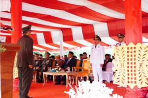 Prosesi pengibaran Bendera Merah Putih berlangsung dengan khidmat, diiringi lagu kebangsaan Indonesia Raya. Seluruh peserta berdiri tegap dengan sikap sempurna, mencerminkan rasa hormat, cinta tanah air, dan kebanggaan terhadap jasa-jasa para pahlawan yang telah gugur memperjuangkan kemerdekaan bangsa Indonesia.
