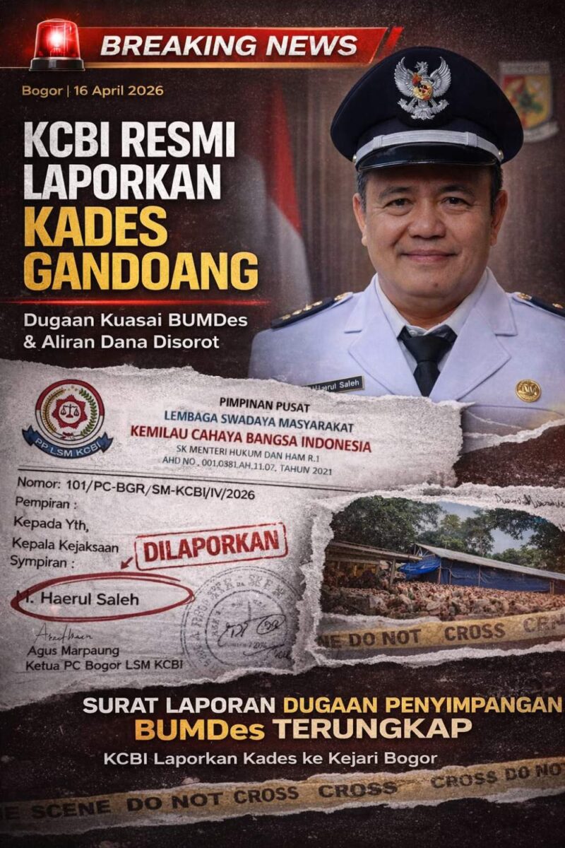 Lembaga Swadaya Masyarakat Kemilau Cahaya Bangsa Indonesia (LSM KCBI) Pimpinan Cabang Bogor secara resmi melaporkan Kepala Desa Gandoang, Kecamatan Cileungsi, Kabupaten Bogor, ke Kejaksaan Negeri Kabupaten Bogor, Kamis (16/04/2026). Laporan tersebut berkaitan dengan dugaan penyalahgunaan wewenang dan ketidaktransparanan dalam pengelolaan Badan Usaha Milik Desa (BUMDes).