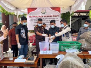 barang bukti tersebut dimusnahkan dengan cara dibakar, dihancurkan dan narkotika jenis sabu dicampurkan dengan air sehingga tidak dapat dipergunakan lagi serta kitap dimusnahkan dengan cara direndam ke air.