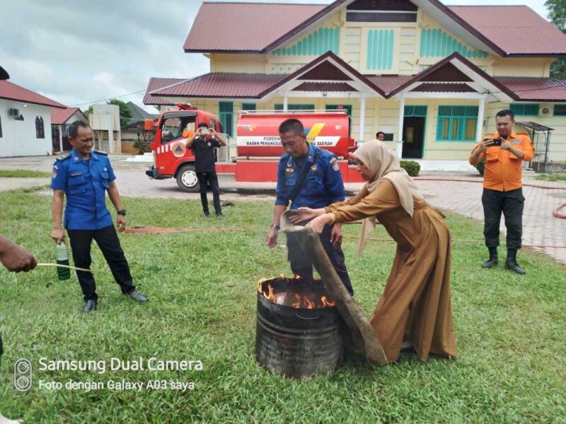 Caption:Rahmayani , S.Pd.I .Staf Kurikulum pada SMA Negeri I kota Langsa mengikuti kegiatan .Pemadaman Kobaran Api. Dengan mungunakan Goni Kain.