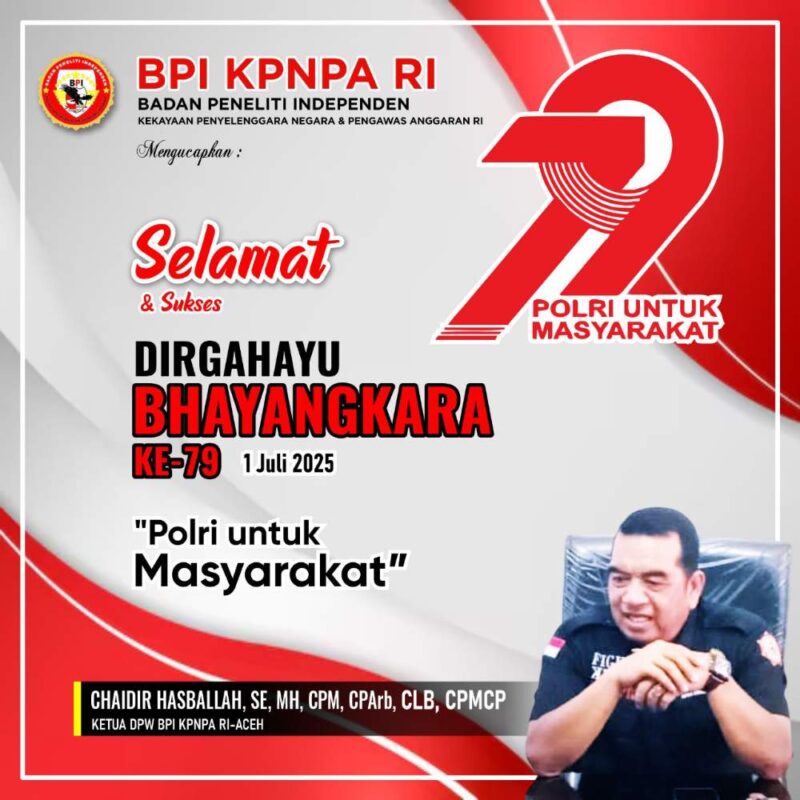 Ketua BPI KPNPA RI Aceh Chaidir Hasballah,SE.,MH.,CPM.,CPArb., CLB., CPMCP. menyampaikan ucapan selamat Hari Ulang Tahun (HUT) Bhayangkara ke-79 Tahun 2025 kepada seluruh jajaran Kepolisian Negara Republik Indonesia (Polri), terkhusus Polisi Daerah (Polda) Aceh dan seluruh jajarannya di wilayah Hukum Aceh.