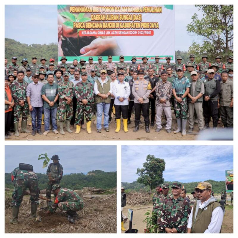 Upaya pemulihan lingkungan pascabencana banjir di Kabupaten Pidie Jaya terus dilakukan secara berkelanjutan melalui aksi nyata penghijauan. Komando Distrik Militer (Kodim) 0102/Pidie bersama Pemerintah Kabupaten Pidie Jaya serta Dinas Lingkungan Hidup dan Kehutanan (DLHK) Provinsi Aceh melaksanakan kegiatan penanaman 1.000 pohon di kawasan Daerah Aliran Sungai (DAS) yang terdampak banjir.