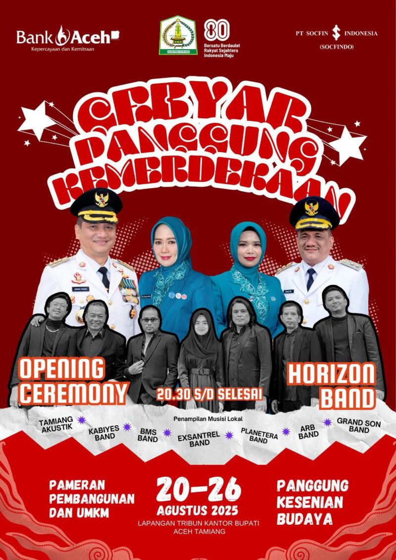 Gebyar Panggung Kemerdekaan Pameran Pembangunan dan UMKM Tahun 2025 akan dibuka langsung Bupati Aceh Tamiang, Irjen Pol. (P) Drs. Armia Pahmi, MH, malam ini, Rabu 20 Agustus 2025 Pukul 20.00 WIB di Lapangan Upacara Tribun Kantor Bupati.