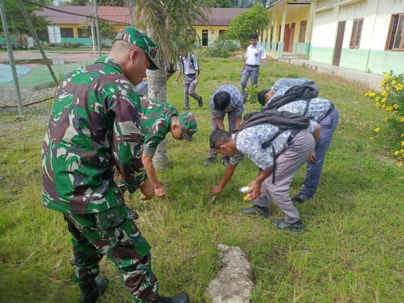 Sertu M. Wartoyo Pada kesempatan ini mendampingi para siswa dalam pembersihan rumput dan sekaligus berinteraksi langsung dengan siswa-siswi.