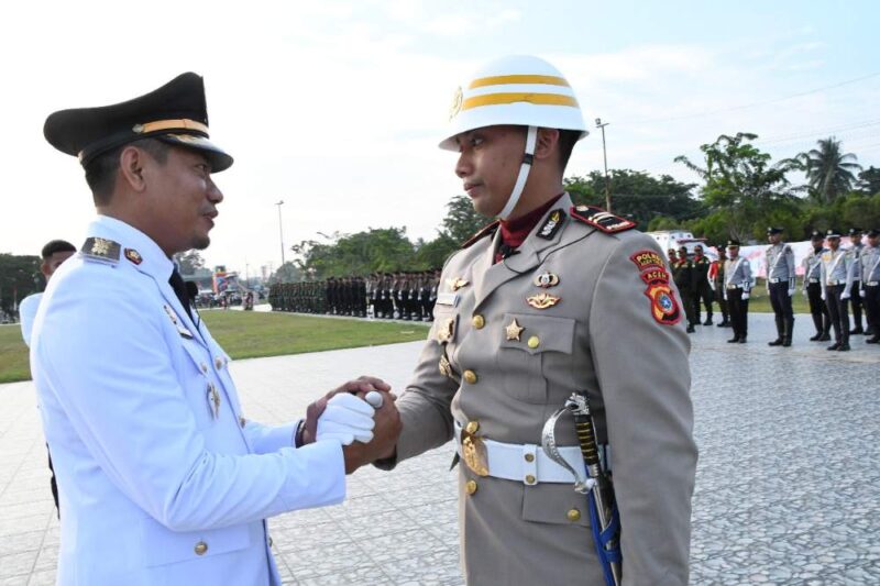 Sebelum, meninggalkan lapangan upacara, Wakil Bupati Aceh Timur memberi hormat kepada peserta upacara yang terdiri dari unsur TNI, Polri, Brimob, ASN, LSM, BPBD, Organisasi Kepemudaan, Pelajar dan Pramuka. (Zainal).