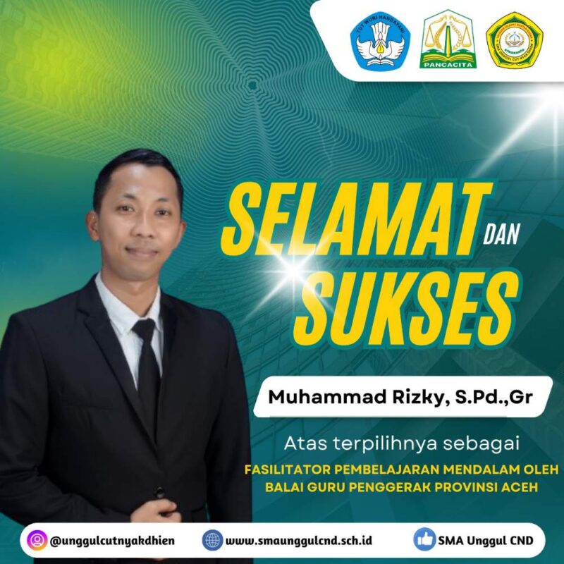 Kabar tersebut di sampaikan langsung oleh Balai Guru Tenaga Kependidikan (BGTK) Aceh pada Minggu 22 Juni 2025 atas nama Kepala Balai Guru Tenaga Kependidikan Aceh Dr. Yudi Herman M.Pd. “Selamat dan Sukses Muhammad Rizky, S.Pd,Gr atas terpilihnya sebagai Fasilitator Pembelajaran Mendalam Oleh Balai Guru Penggerak Provinsi Aceh’.