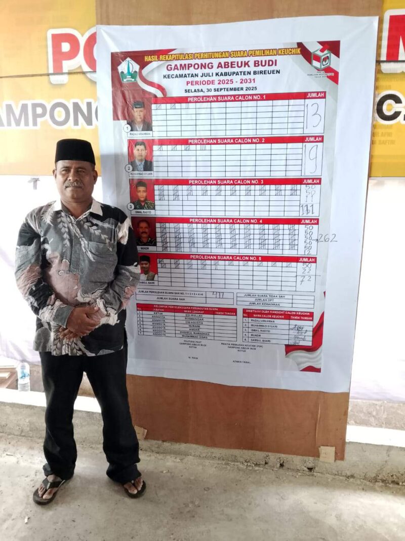 Munzir berhasil terpilih sebagai Keuchik Abeuk Budi Masa Bakti 2025 – 2031 setelah berhasil menyisihkan empat rivalnya Razali Arahman nomor urut 1, Muhammad Syukri nomor urut 2, Ismail Rasyid nomor urut 3 dan Samsul Bahri nomor urut 5.