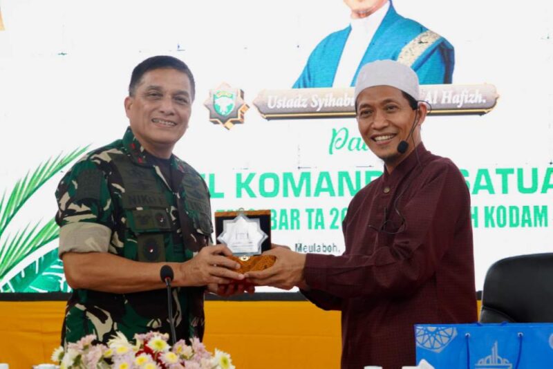 Kegiatan yang berlangsung dengan penuh khidmat ini ditutup dengan penyerahan cinderamata oleh Pangdam IM kepada Ustad Syihabudin Isykarima sebagai bentuk penghargaan atas kontribusinya dalam memperkaya nilai-nilai spiritual dalam tubuh prajurit TNI.