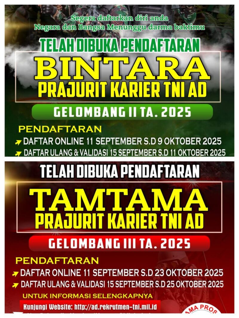 Komando Daerah Militer Iskandar Muda (Kodam IM) kembali membuka kesempatan bagi putra-putra terbaik bangsa, khususnya dari Provinsi Aceh, untuk bergabung menjadi prajurit Tentara Nasional Indonesia Angkatan Darat (TNI AD). Pendaftaran Calon Bintara TNI AD Gelombang II Tahun Anggaran 2025 resmi dibuka mulai 11 September hingga 9 Oktober 2025. Sementara itu, pendaftaran Calon Tamtama TNI AD Gelombang III Tahun Anggaran 2025 berlangsung sejak 11 September hingga 23 Oktober 2025.