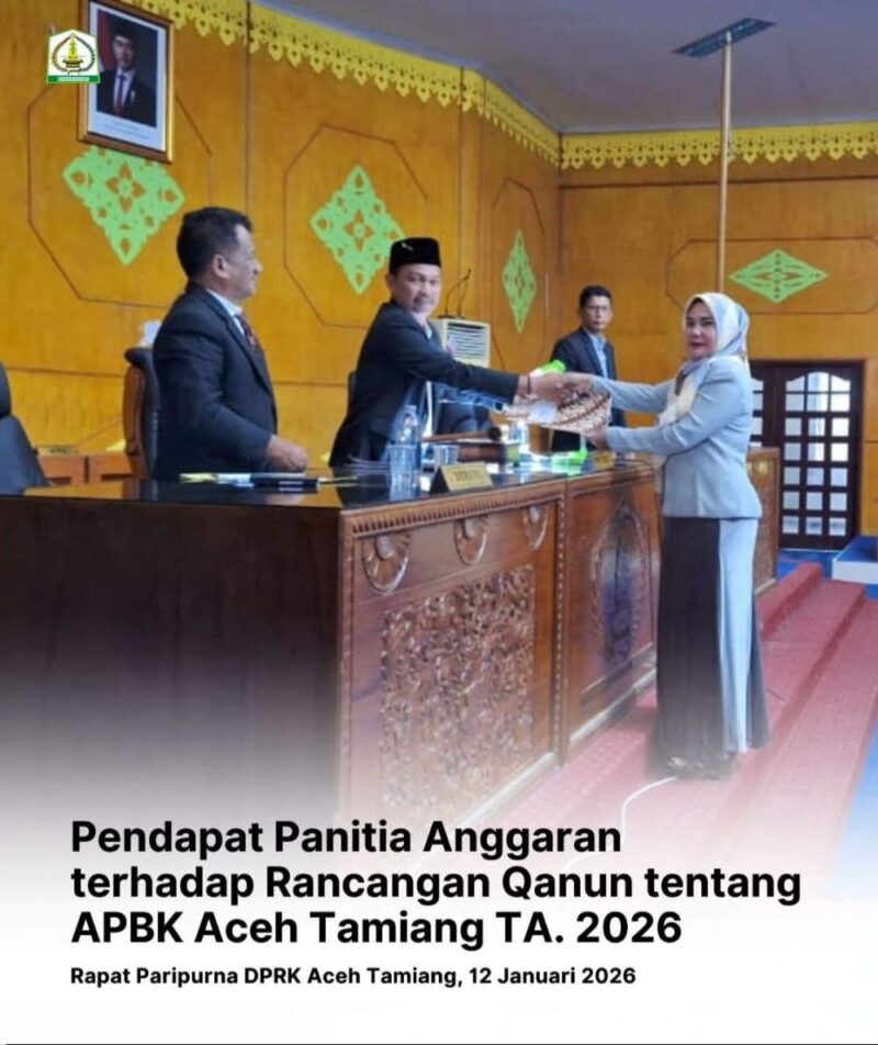Panitia Anggaran DPRK Aceh Tamiang melalui juru bicaranya, Erawati IS, SH, menyampaikan hasil pembahasan Rancangan Qanun tentang Anggaran Pendapatan dan Belanja Kabupaten (APBK) Aceh Tamiang Tahun Anggaran (TA) 2026. Dalam rapat yang digelar pada Senin (12/1/2026), Panitia Anggaran telah menyepakati APBK TA 2026 dengan pendapatan daerah sebesar Rp 1.176.638.098.477,00 dan belanja daerah sebesar Rp 1.304.179.277.027,96.