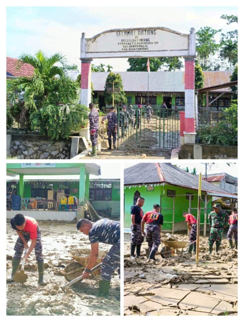 InfoLangsa.Com – Aceh Tamiang Setelah banjir yang melanda di beberapa desa dalam Kecamatan Trumon Raya beberapa waktu yang lalu, Anggota Koramil 09/Banda Mulia bersama Marinir dan Dewan Guru Sekolah Dasar MIN 5 Telaga Meku melaksanakan Pembersih SD MIN 5 Telaga Meku, Kecamatan Banda Mulia, Kabupaten Aceh Tamiang, Langkah ini diambil untuk memulihkan kondisi sekolah yang terdampak banjir bandang agar segera bisa digunakan kembali untuk aktivitas belajar. Minggu (04/01/2026)