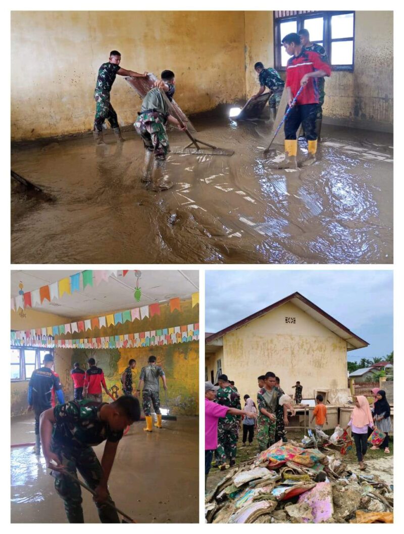 Babinsa Koramil 04/Bendahara Sertu Tomi bersama satgas Penanggulangan Bencana dari Batalyon TP 853/BRB membantu warga membersihkan sisa lumpur dan sampah di TPA Miftahul Ulum Desa Seunebok Dalam Mesjid, Kecamatan Bendahara, Kabupaten Aceh Tamiang. Jumat (09/01/2026)