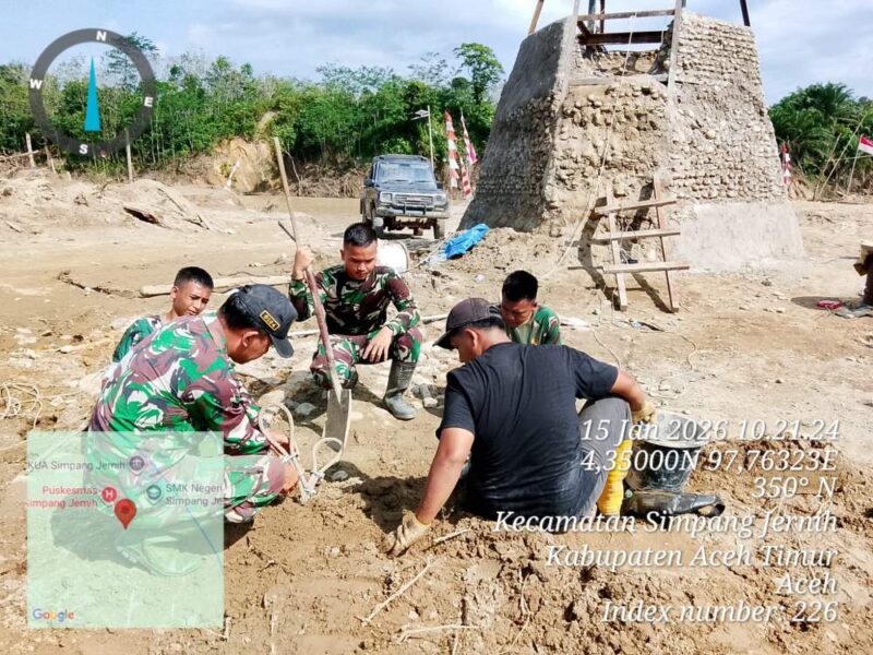 Kamis 15 Januari 2026 Sertu Taufiq, Babinsa Koramil 10/Simpang Jernih, bersama personel Yon TP 853/BRB melaksanakan kegiatan pengambilan material pasir dan batu serta pemasangan sling, lugging, dan deadmen dalam rangka pembangunan jembatan gantung penghubung antar dua desa, yaitu Desa Batu Sumbang dengan Desa Pante Kera, Kecamatan Simpang Jernih, Kabupaten Aceh Timur.