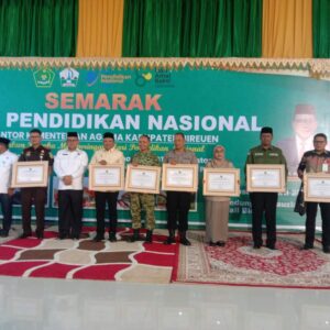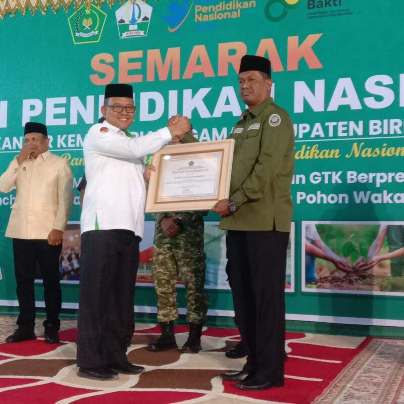 Penghargaan ini diserahkan oleh Kepala Kantor Wilayah Kementrian Agama Provinsi Aceh, Drs. H. Azhari, M.Si dan diterima langsung oleh Bupati Bireuen, Ir. Mukhlis, ST, dalam rangkaian acara Semarak Hari Pendidikan Nasional (Hardiknas) Tahun 2026 yang berlangsung di Gedung Hj. Fauziah Convention Hall, Selasa (28/04).