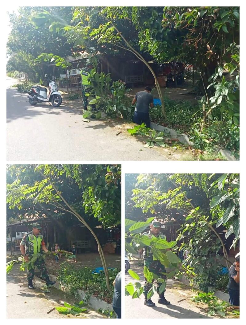 Upaya Memelihara Jalan Agar Tetap Bersih Dan Rapi, Babinsa Bersama Warga Gotong Royong Bersihkan Kanan Kiri Jalan