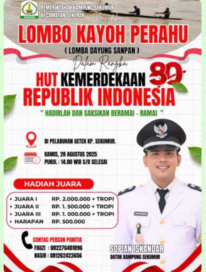 Untuk Memeriahkan Hari Kemerdekaan Republik Indonesia Ke – 80 Pemerintahan Desa Kampung Sekumur Kecamatan Sekerak Kabupaten Aceh Tamiang gelar Lomba kayoh perahu yang akan di laksanakan pada hari kamis 28 Agustus 2025.
