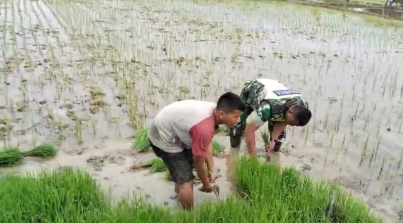 Seperti halnya yang dilakukan Serka Rusli yang tak segan untuk terjun langsung ke sawah, membantu para petani untuk mengumpulkan bibit padi yang siap untuk ditanam di lahan milik petani.