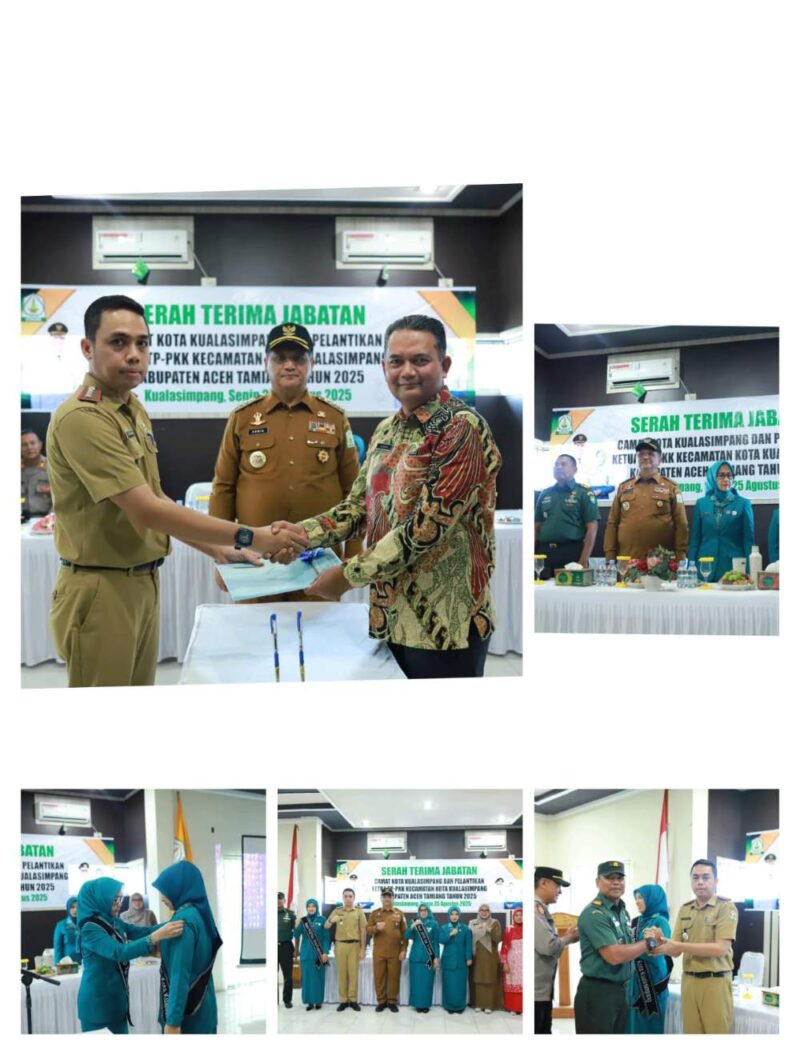 Bupati Aceh Tamiang, Irjen Pol. (P) Drs. Armia Pahmi, MH, memimpin prosesi serah terima jabatan Camat Kota Kualasimpang dari Azhari, SE kepada Dr. Cakra Abbas, SHI, MH, sekaligus menyaksikan pelantikan Ketua TP-PKK dan Bunda PAUD Kecamatan, Senin (25/8/25) di Kantor Camat setempat.
