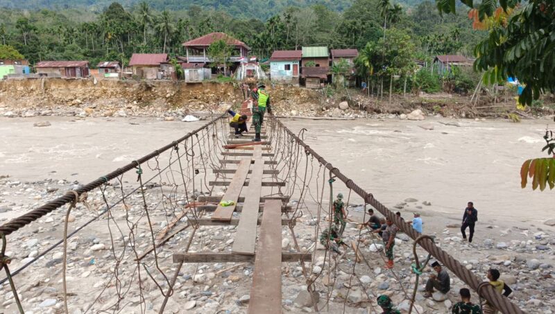 Prajurit TNI dari Posramil Darul Hasanah jajaran Kodim 0108/Aceh Tenggara, Korem 011/Lilawangsa, Kodam Iskandar Muda, bersama masyarakat Desa Buntul Kendawi, Kecamatan Darul Hasanah, Kabupaten Aceh Tenggara, kembali melaksanakan kegiatan perbaikan jembatan gantung yang menjadi akses vital penghubung antar desa.
