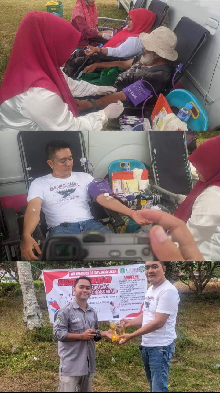 KKN kelompok 35 IAIN Langsa 2025 menggelar kegiatan donor darah yang bekerja sama dengan PMI Kota Langsa di lapangan desa buket metuah, kegiatan ini merupakan program kerja juga kelompok KKN yang dilakukan bertepatan dengan HUT Republik Indonesia ke-80.