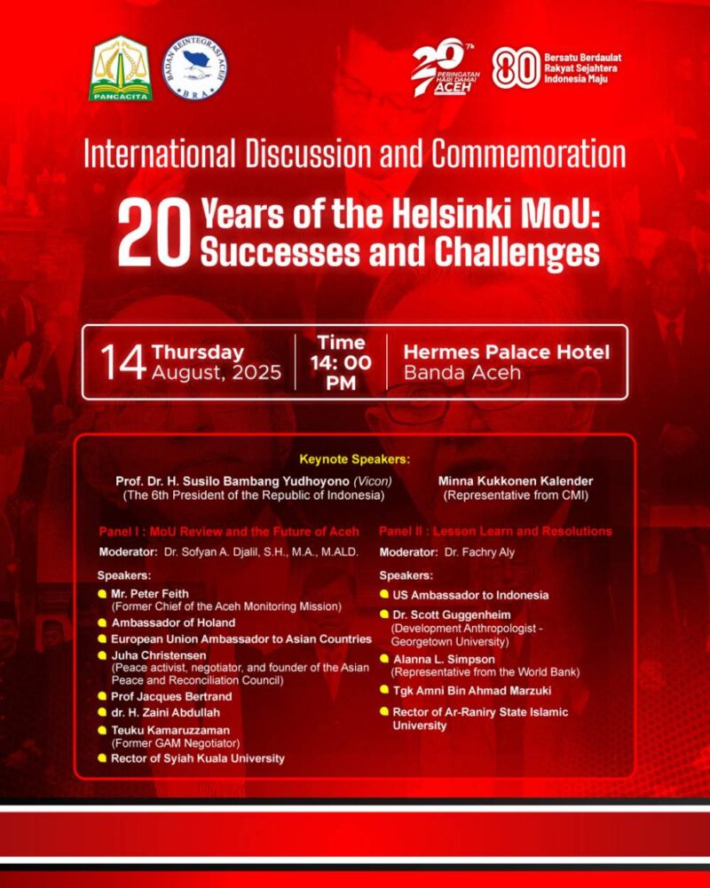 Ratusan tokoh terkemuka Aceh, bersama akademisi, perwakilan LSM internasional, dan diplomat dari 12 negara, akan berkumpul di Banda Aceh dalam rangka Diskusi dan Peringatan Internasional 20 Tahun MoU Helsinki: “Progress and Challenges”. di Hermes Palace Hotel, Banda Aceh.