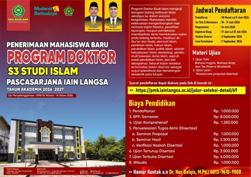 Institut Agama Islam Negeri (IAIN) Langsa akan membuka pendaftaran mahasiswa baru Program Doktor (S-3) Studi Islam untuk tahun akademik 2026/2027. Pendaftaran dijadwalkan berlangsung mulai 30 Maret hingga 5 Juni 2026.